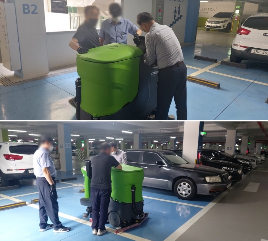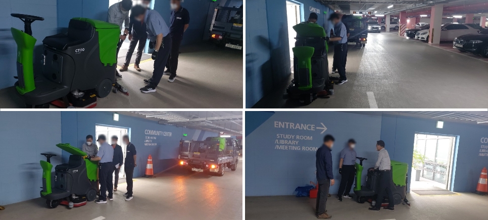 에폭시 재질로 이루어진 바닥을 기존에는 마대자루를 이용해서 인력으로만 청소하셨다고 하시더라구요.. 꽤 넓은 현장이었는데 하나하나 손으로 청소하셨다고 생각하니 실무자분들께서 그동안 얼마나 고생하셨을지..!