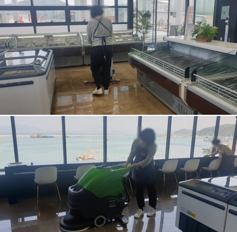 바닥청소차 CT55B55는 단순하게 밀고다니시면 알아서 청소가 끝나는 제품이라 처음 다뤄보시는 장비임에도 불구하고 장비의 사용방법이 매우 쉬워서 사용설명을 10분만 들어보시고 바로 사용이 가능하기 때문에 굉장히 만족스러워하셨다고 하네요ㅎㅎ