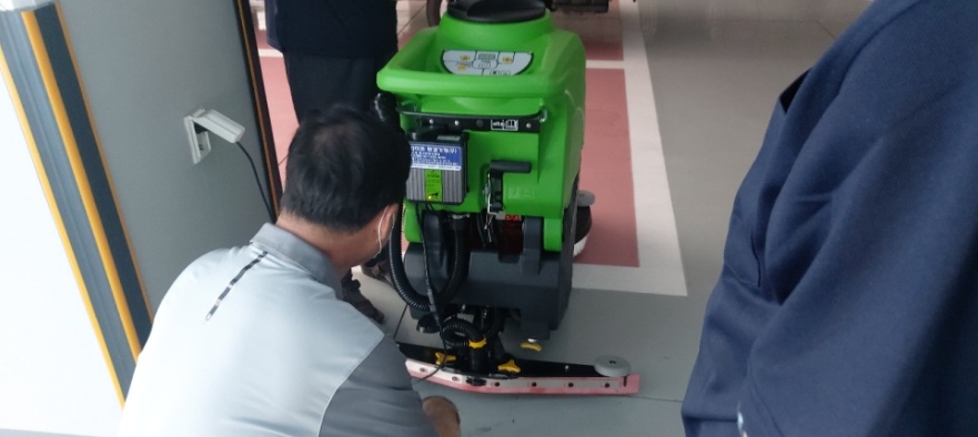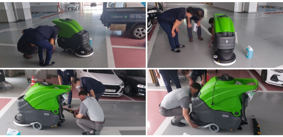 바닥청소장비 CT55B55를 사용해보시고 모르는 부분은 그때그때 알려드려 익숙해지시도록 도와드리고 있는 모습의 라이프환경기계입니다.