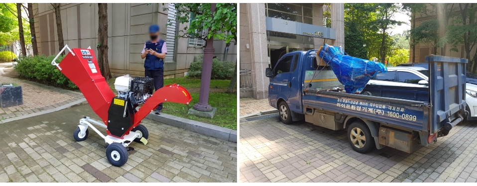 대부분 나무파쇄를 할 때에는 큰 차량을 이용해서 대량으로 진행하고 있지만 소량의 나뭇가지들은 큰 차량을 이용해서 작업하는 것이 비효율적이랍니다.